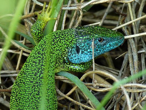 ComportementAprès la période d'hibernation, ce lézard entre en quête d'une femelle. Il lui arrive alors de se battre sauvagement avec d'autres mâles (voir la dernière photo de l'article), puis il s'accouple de la même façon que le Lézard vert. Quelques mois après, la femelle pond entre cinq et vingt œufs de 2 cm de long dans du bois décomposé ou sous une pierre. Les embryons mettent six à quatorze semaines à se développer avant d'éclore. Les jeunes, qui sont vert très clair avec des anneaux jaunes sur les flancs, mettent trois ans à atteindre leur maturité sexuelle. À mesure que l'adulte avance en âge, sa couleur fonce et les ocelles bleues apparaissent. Il peut vivre jusqu'à 25 ans.